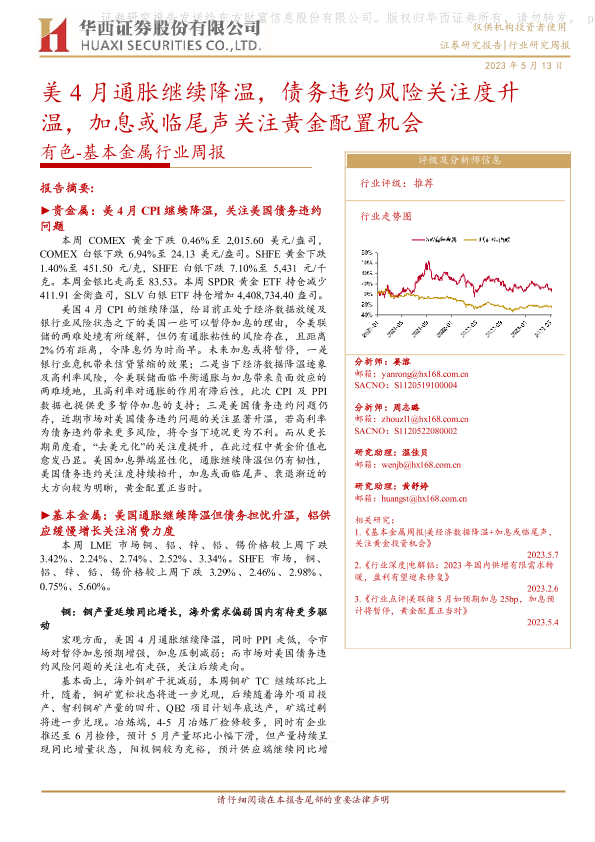 【华西证券】【20230513】有色基本金属行业周报:美4月通胀继续降温,债务违约风险关注度升温,加息或临尾声关注黄金配置机会-22页