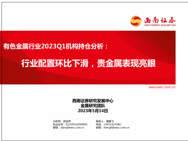 【西南证券】【20230514】有色金属行业2023Q1机构持仓分析:行业配置环比下滑,贵金属表现亮眼-18页