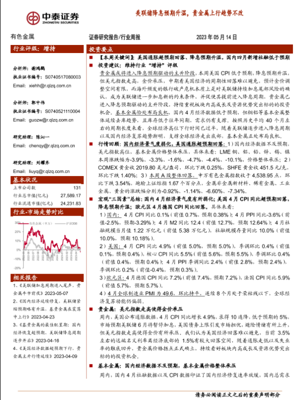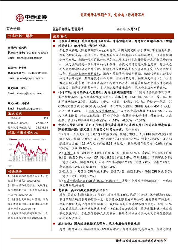 【中泰证券】【20230514】有色金属行业周报:美联储降息预期升温,贵金属上行趋势不改-33页