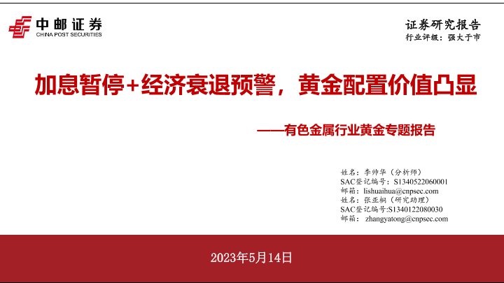【中邮证券】【20230514】有色金属行业黄金专题报告:加息暂停+经济衰退预警,黄金配置价值凸显-29页