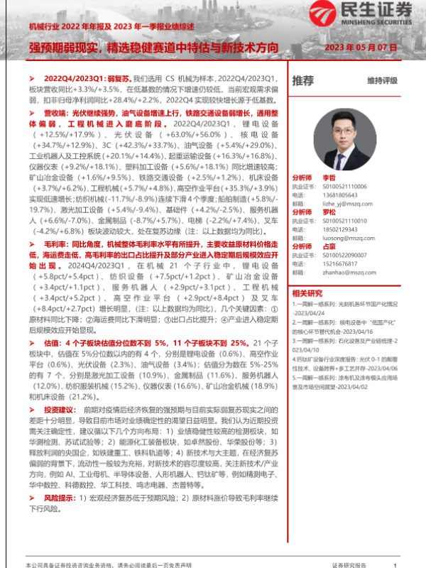 【民生证券】【20230507】机械行业2022年年报及2023年一季报业绩综述:强预期弱现实,精选稳健赛道中特估与新技术方向-40页