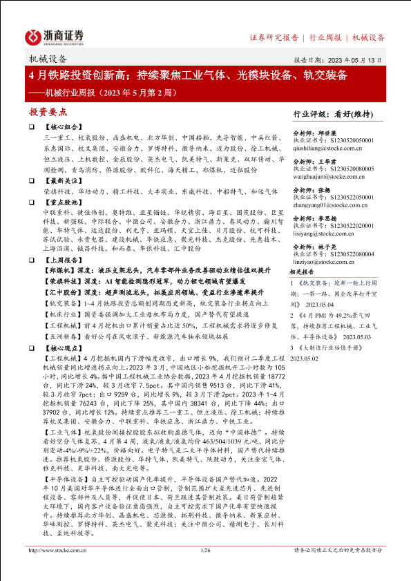 【浙商证券】【20230513】机械行业周报(2023年5月第2周):4月铁路投资创新高;持续聚焦工业气体、光模块设备、轨交装备-26页