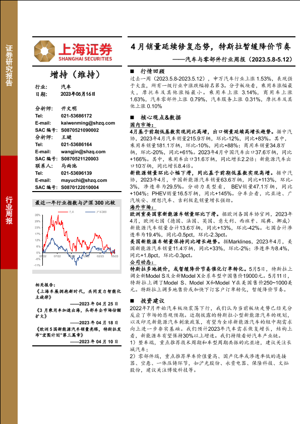 【上海证券】【20230516】汽车与零部件行业周报:4月销量延续修复态势,特斯拉暂缓降价节奏-17页