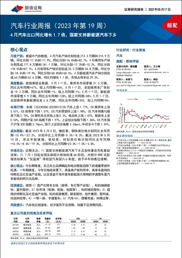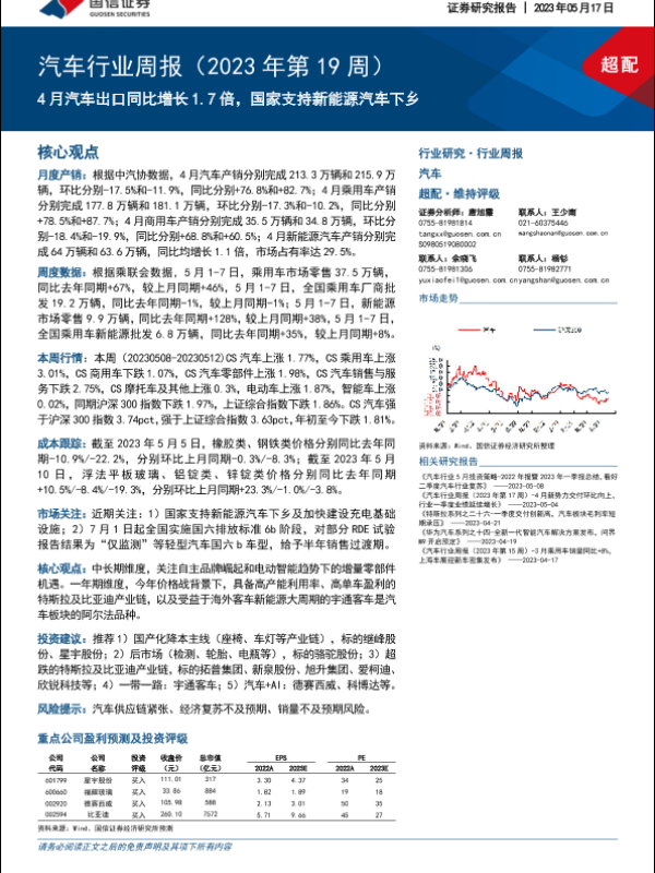 【国信证券】【20230517】汽车行业周报(2023年第19周):4月汽车出口同比增长1.7倍,国家支持新能源汽车下乡-36页