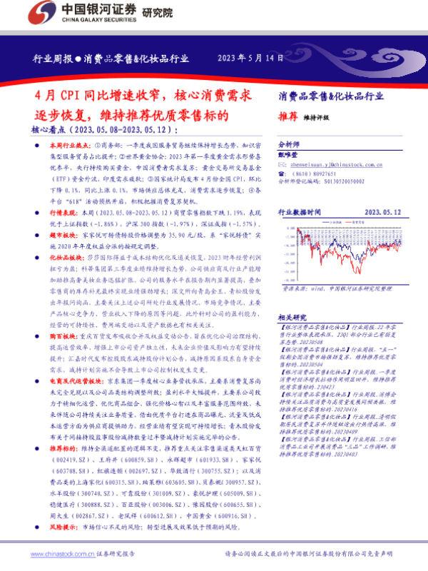 【银河证券】【20230514】消费品零售&化妆品行业周报:4月CPI同比增速收窄,核心消费需求逐步恢复,维持推荐优质零售标的-30页