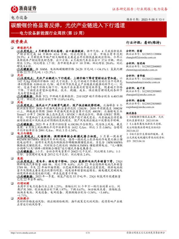 【浙商证券】【20230513】电力设备新能源行业周报(第19周):碳酸锂价格显著反弹,光伏产业链进入下行通道-31页