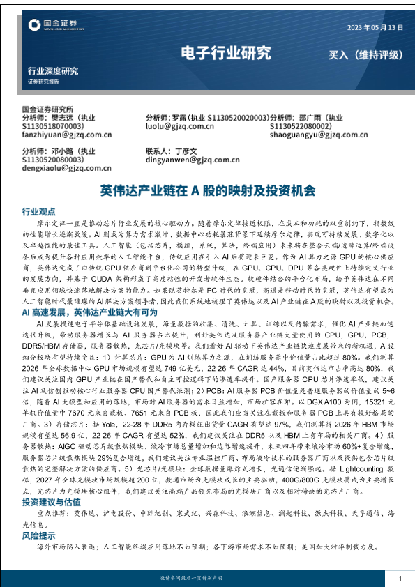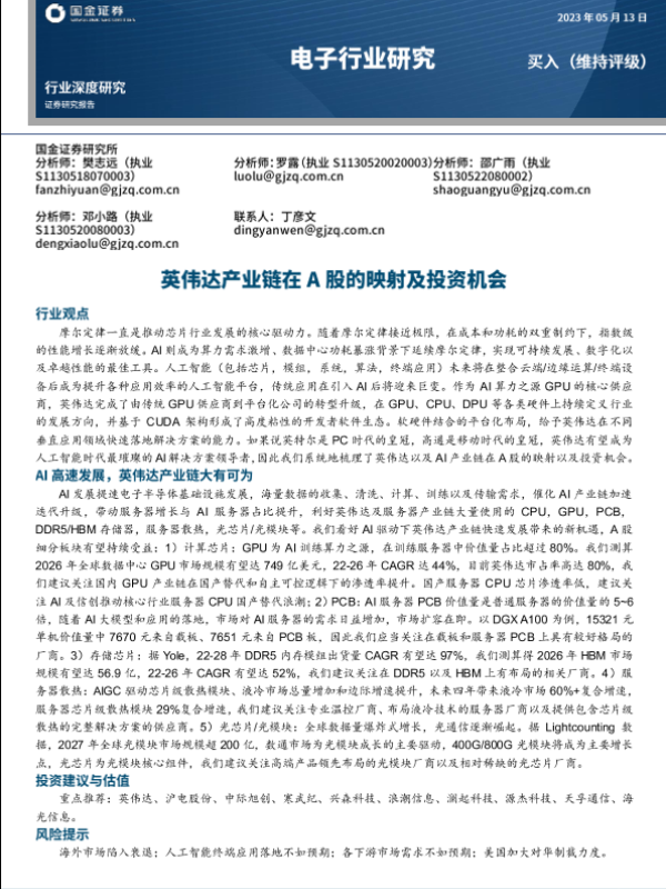 【国金证券】【20230513】电子行业深度研究:英伟达产业链在A股的映射及投资机会-48页
