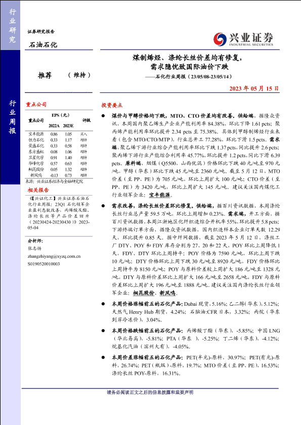 【兴业证券】【20230515】煤制烯烃、涤纶长丝价差均有修复,需求隐忧致国际油价下跌-16页