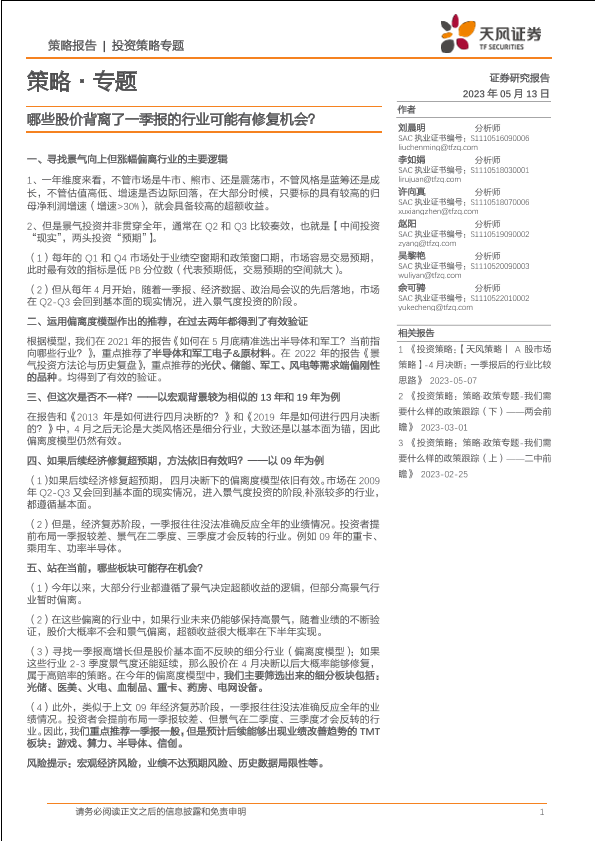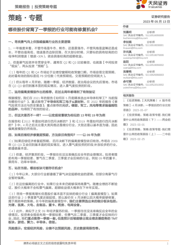 【天风证券】【20230513】策略·专题:哪些股价背离了一季报的行业可能有修复机会?-16页