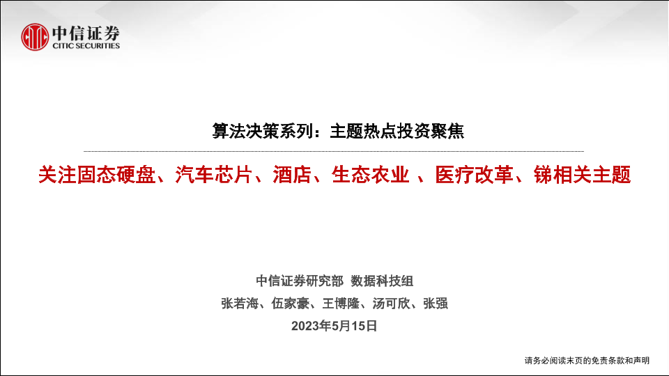 【中信证券】【20230515】算法决策系列:主题热点投资聚焦关注固态硬盘、汽车芯片、酒店、生态农业、医疗改革、锑相关主题-15页