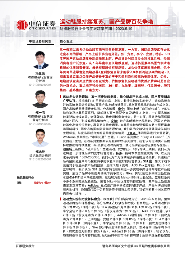 【中信证券】【20230519】纺织服装行业景气度跟踪第五期:运动鞋服持续复苏,国产品牌百花争艳-77页