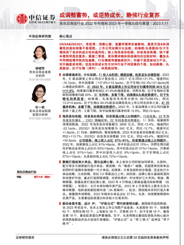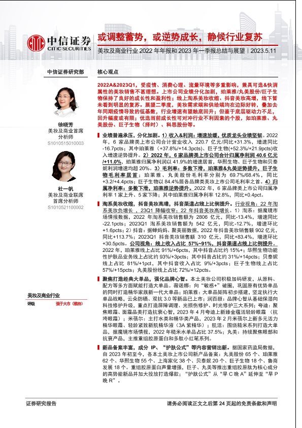 【中信证券】【20230511】美妆及商业行业2022年年报和2023年一季报总结与展望:或调整蓄势,或逆势成长,静候行业复苏-25页