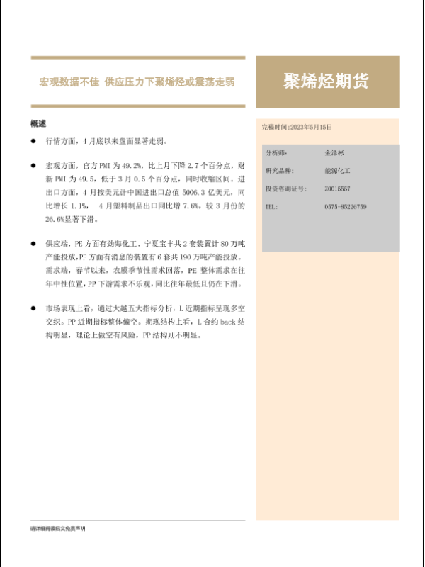【大越期货】【20230515】聚烯烃期货月度报告:宏观数据不佳,供应压力下聚烯烃或震荡走弱-20页