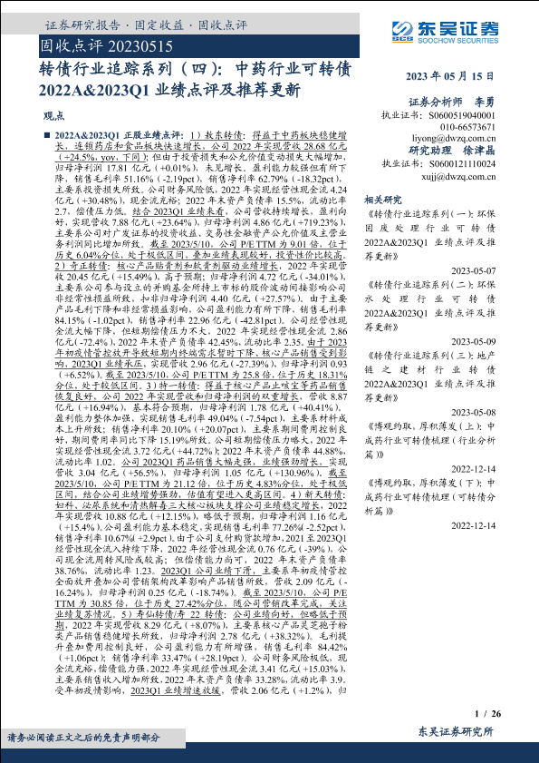 【东吴证券】【20230515】转债行业追踪系列(四):中药行业可转债2022A&2023Q1业绩点评及推荐更新-26页