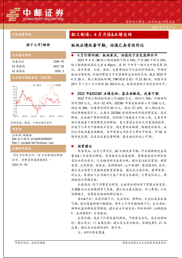 【中邮证券】【20230507】轻工制造行业4月月报&业绩总结:板块业绩改善可期,估值已具有性价比-24页