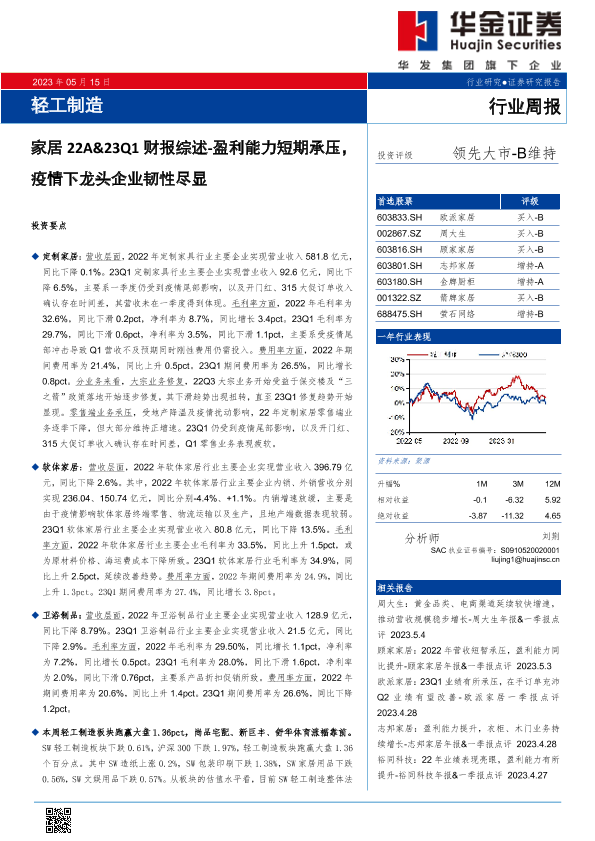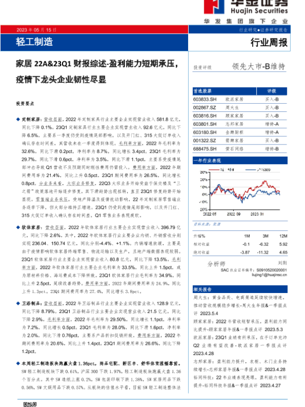【华金证券】【20230515】轻工制造行业周报:家居22A&23Q1财报综述-盈利能力短期承压,疫情下龙头企业韧性尽显-34页