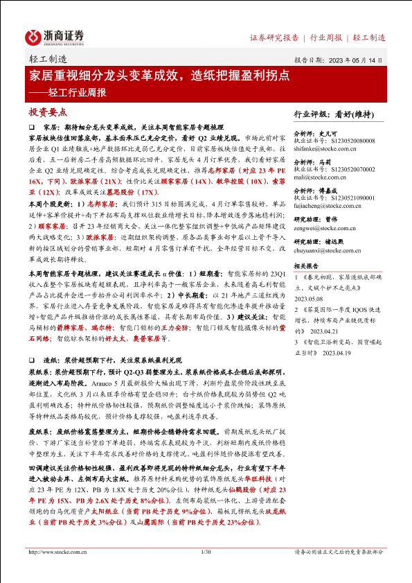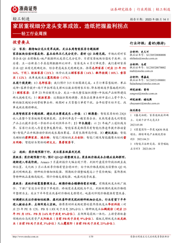 【浙商证券】【20230514】轻工行业周报:家居重视细分龙头变革成效,造纸把握盈利拐点-30页