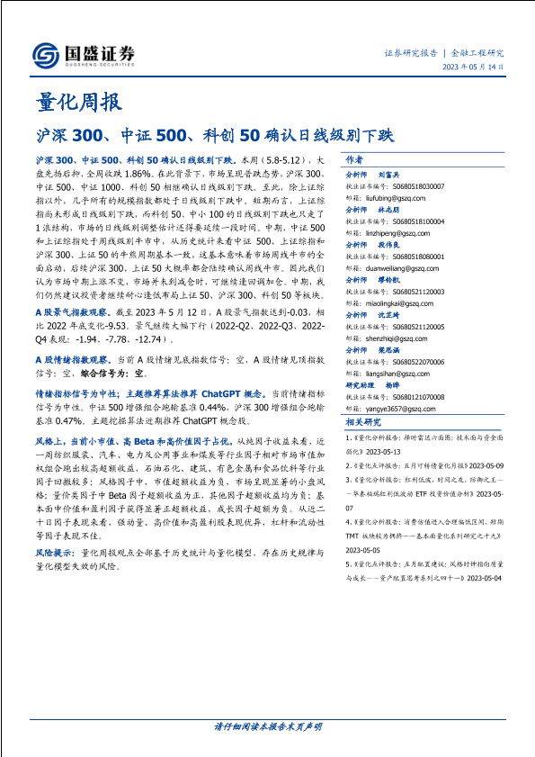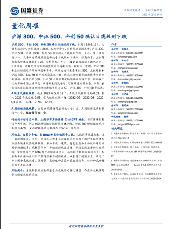 【国盛证券】【20230514】量化周报:沪深300、中证500、科创50确认日线级别下跌-23页