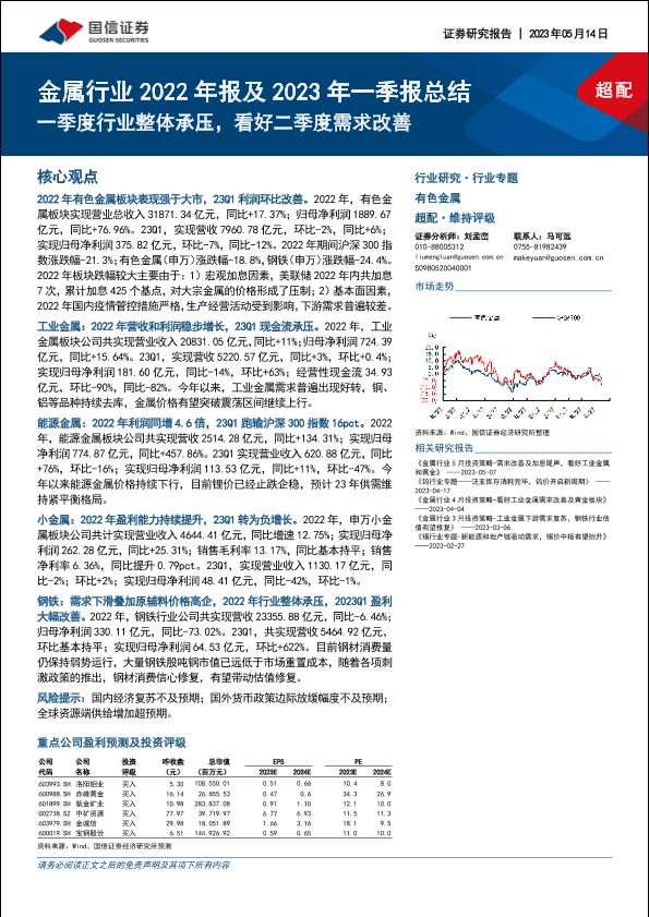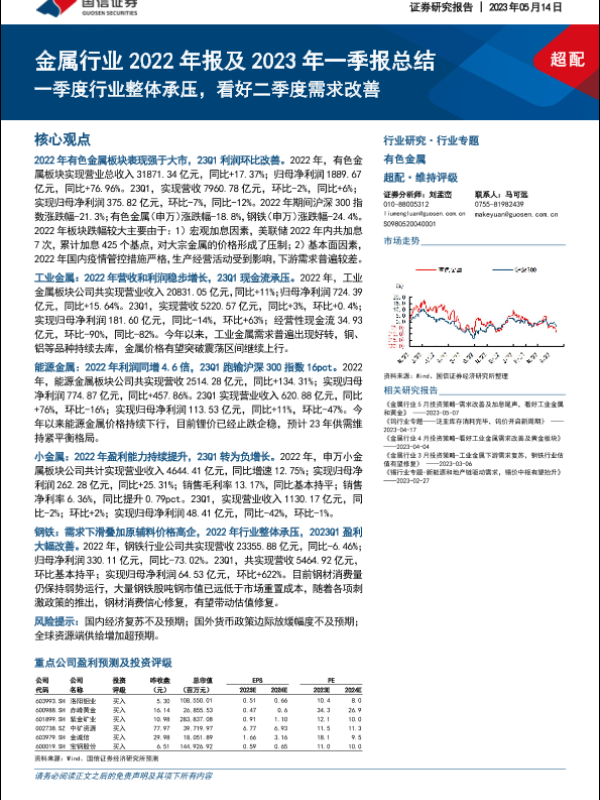 【国信证券】【20230514】金属行业2022年报及2023年一季报总结:一季度行业整体承压,看好二季度需求改善-24页