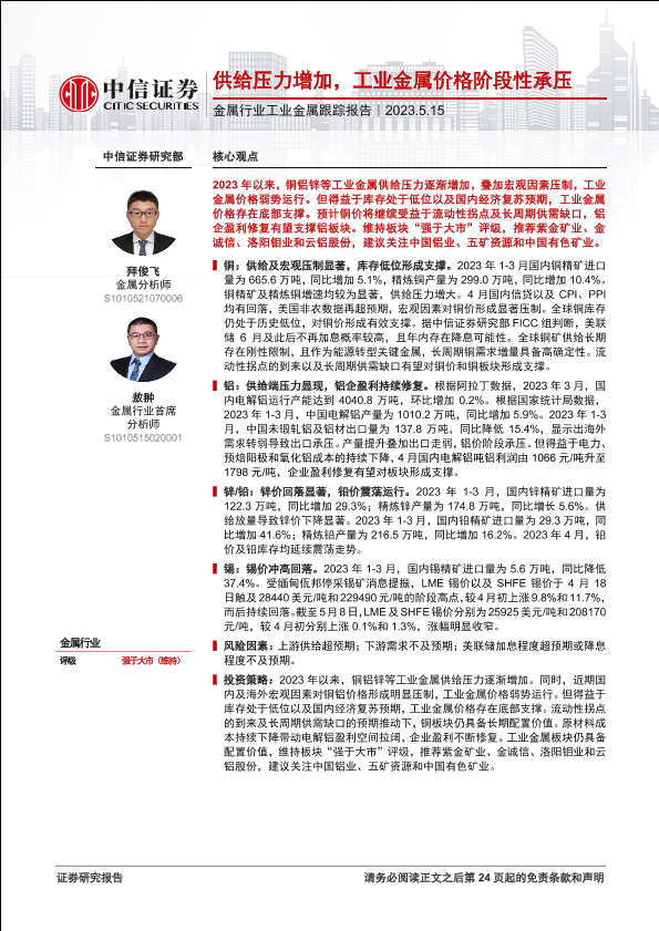 【中信证券】【20230515】金属行业工业金属跟踪报告:供给压力增加,工业金属价格阶段性承压-25页