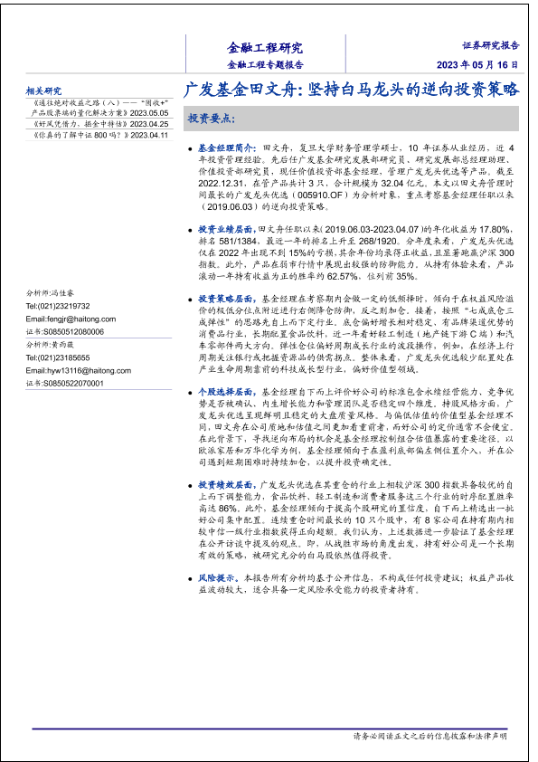 【海通证券】【20230516】金融工程专题报告:广发基金田文舟,坚持白马龙头的逆向投资策略-19页