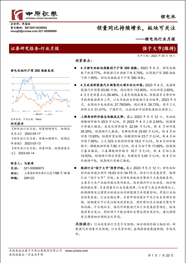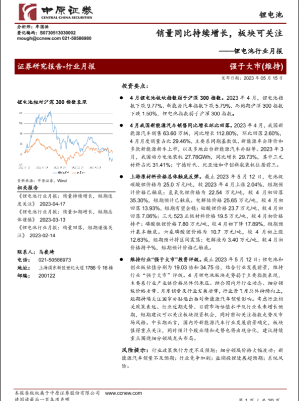 【中原证券】【20230515】锂电池行业月报:销量同比持续增长,板块可关注-20页