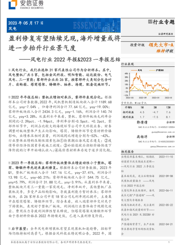 【安信证券】【20230517】风电行业2022年报&2023一季报总结:盈利修复有望陆续兑现,海外增量或将进一步抬升行业景气度-18页
