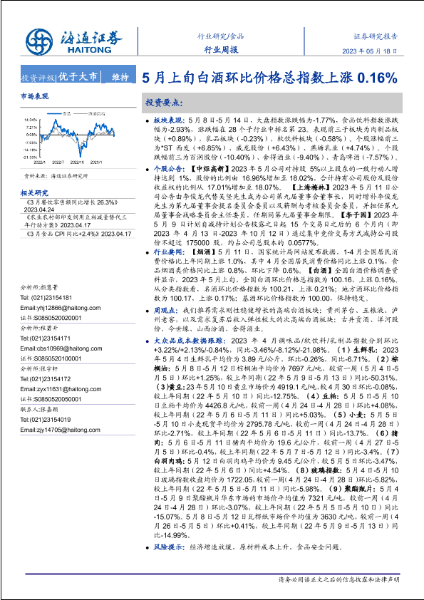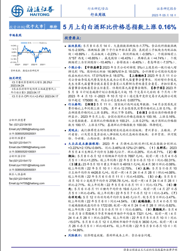 【海通证券】【20230518】食品行业周报:5月上旬白酒环比价格总指数上涨0.16%-16页