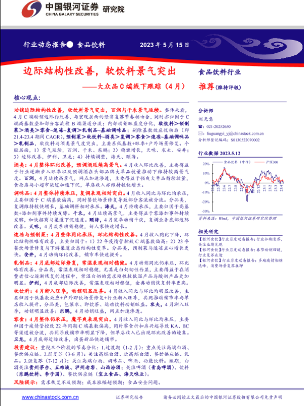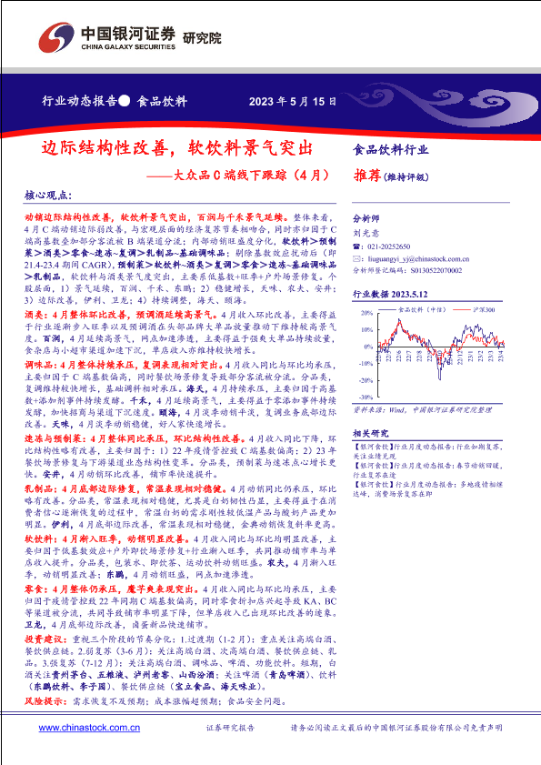 【银河证券】【20230515】食品饮料行业动态报告:大众品C端线下跟踪(4月)-边际结构性改善,软饮料景气突出-32页