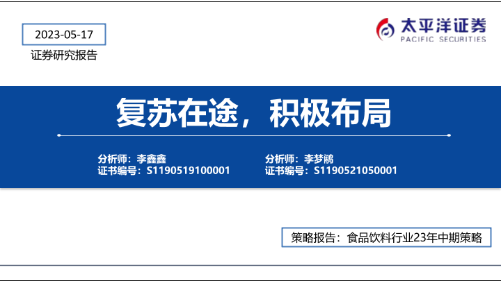 【太平洋证券】【20230517】食品饮料行业23年中期策略:复苏在途,积极布局-62页