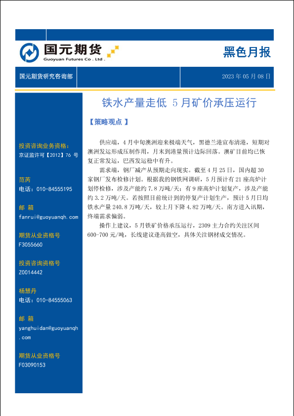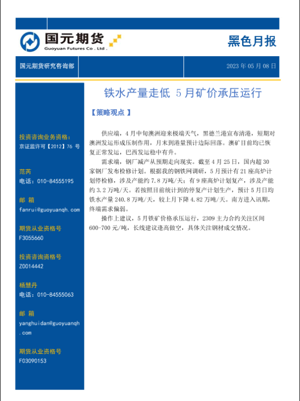 【国元期货】【20230508】黑色月报:铁水产量走低,5月矿价承压运行-15页