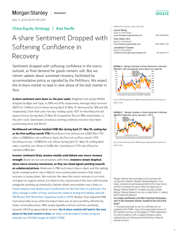 【Morgan Stanley】【20230511】中国股市策略:A股情绪随复苏信心减弱而下降-12页