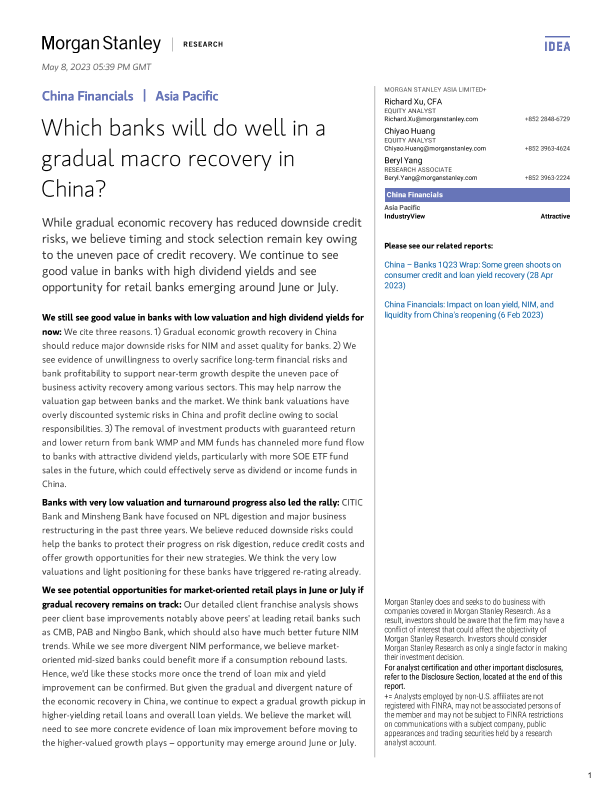 【Morgan Stanley】【20230508】中国金融行业:哪些银行将在逐步的宏观经济复苏中表现良好?-20页