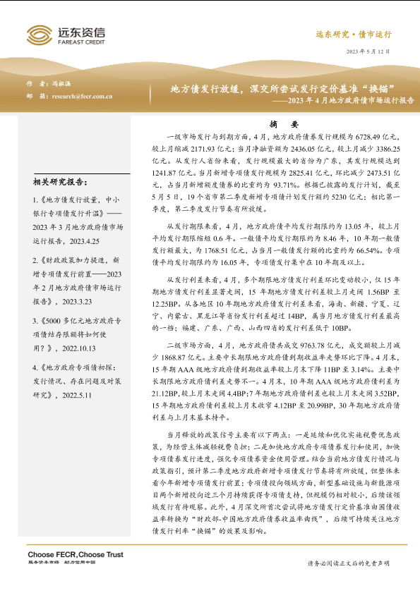 【远东资信】【20230512】地方债发行放缓,深交所尝试发行定价基准“换锚”——2023年4月地方政府债市场运行报告-12页