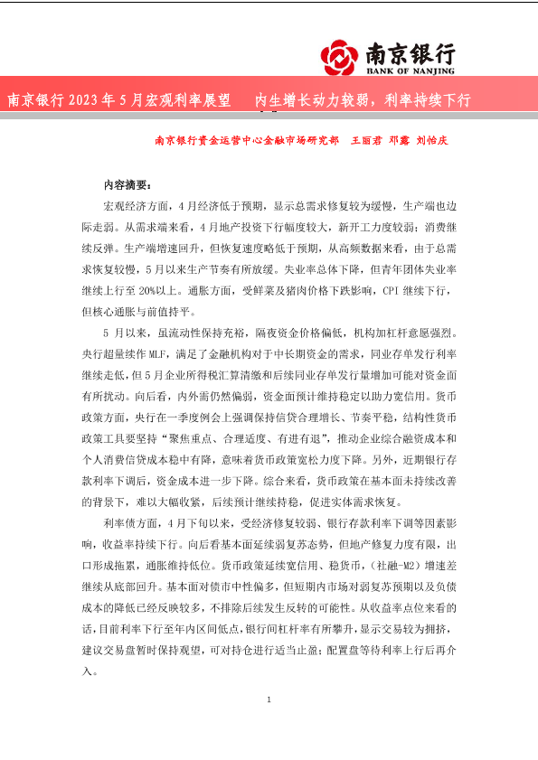 【南京银行】【20230520】2023年5月宏观利率展望:内生增长动力较弱,利率持续下行-30页