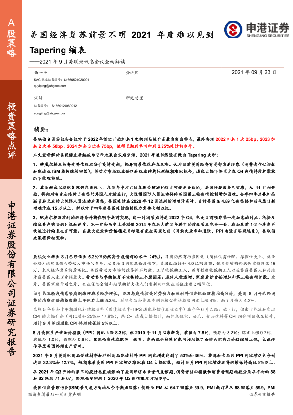 【申港证券】【20210923】2021年9月美联储议息会议全面解读:美国经济复苏前景不明,2021年度难以见到Tapering缩表-34页
