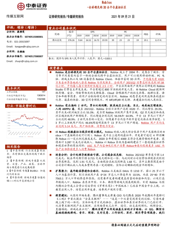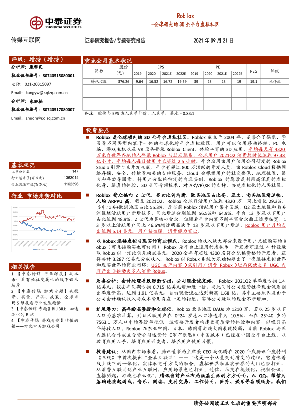 【中泰证券】【20210921】传媒互联网行业:Roblox,全球领先的3D全平台虚拟社区-20页