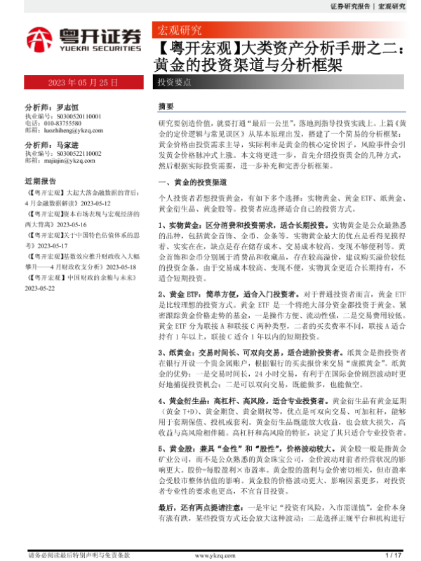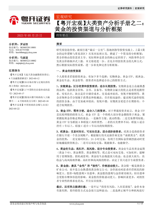 【粤开证券】【20230525】【粤开宏观】大类资产分析手册之二:黄金的投资渠道与分析框架-17页