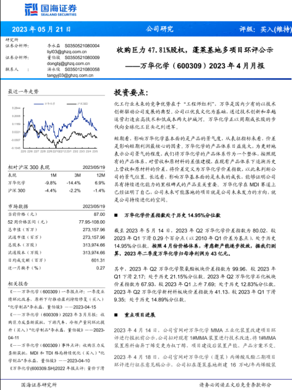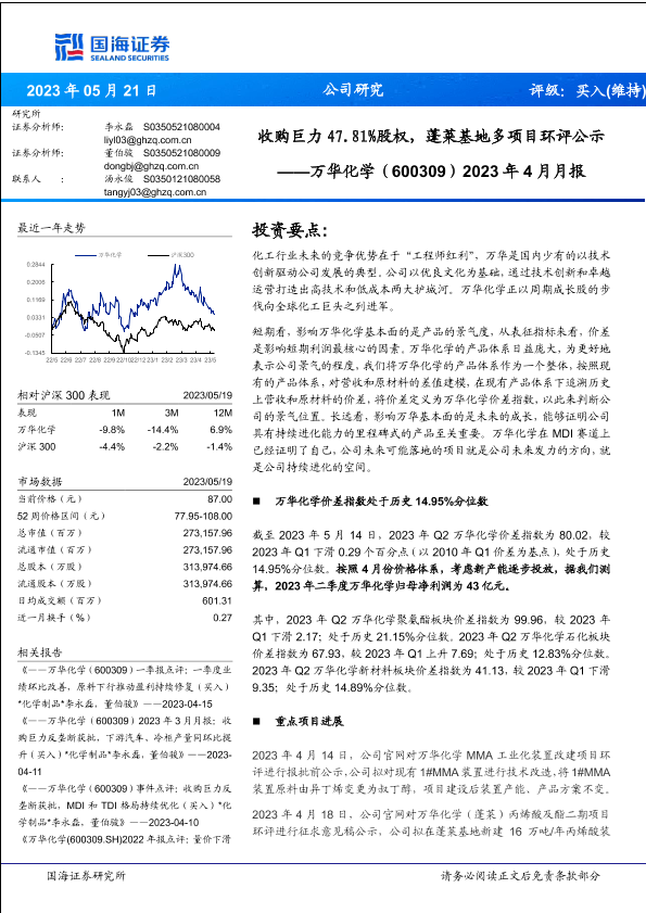 【国海证券】【20230521】万华化学2023年4月月报:收购巨力47.81%股权,蓬莱基地多项目环评公示-35页