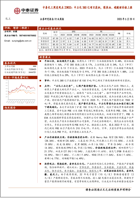 【中泰证券】【20230520】中泰化工周度观点23W20:中石化380亿项目获批,煤焦油、碳酸锂价格上涨-22页