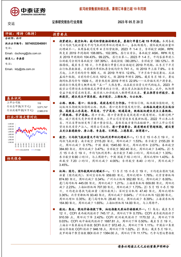 【中泰证券】【20230520】交运行业周报:航司经营数据持续改善,暑期订单量已超19年同期-39页