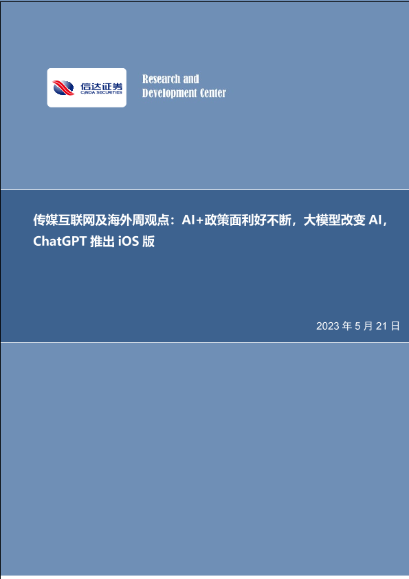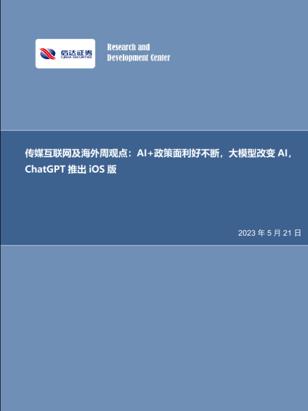 【信达证券】【20230521】传媒互联网周观点:AI+政策面利好不断,大模型改变AI,ChatGPT推出iOS版-26页
