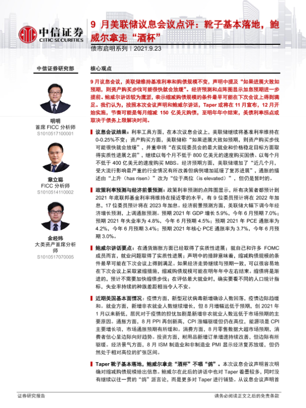 【中信证券】【20210923】债市启明系列:9月美联储议息会议点评,靴子基本落地,鲍威尔拿走“酒杯”-32页
