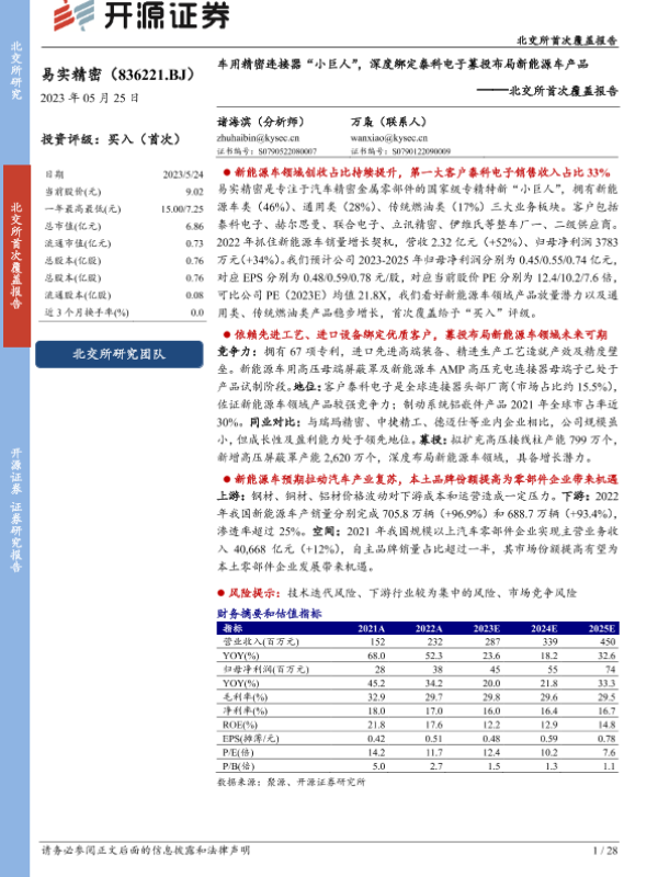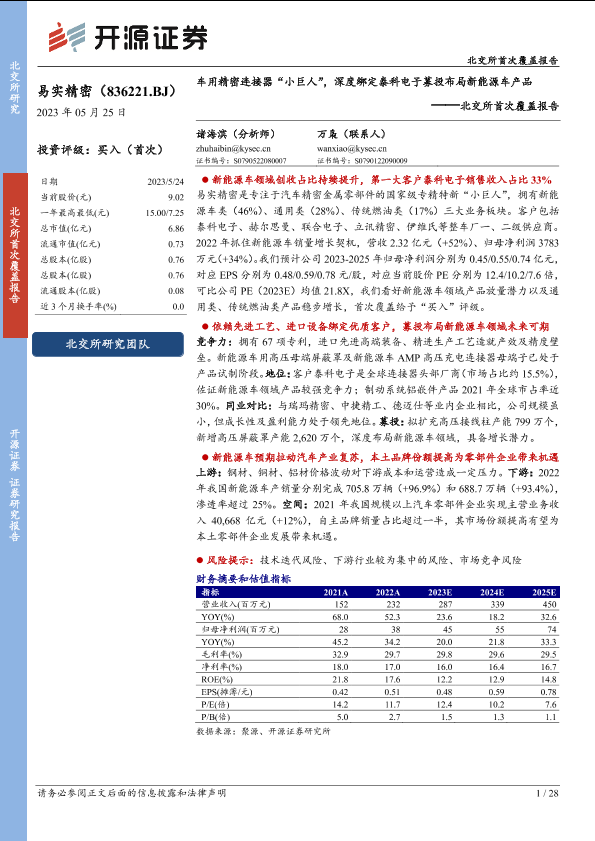 【开源证券】【20230525】北交所首次覆盖报告:车用精密连接器“小巨人”,深度绑定泰科电子募投布局新能源车产品-28页