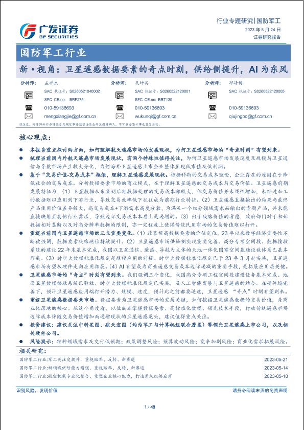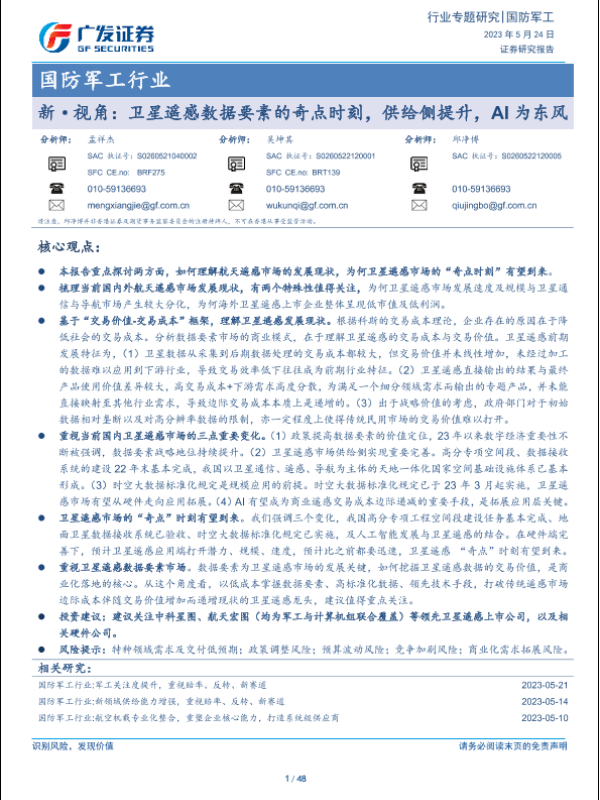 【广发证券】【20230524】国防军工行业专题研究:新·视角:卫星遥感数据要素的奇点时刻,供给侧提升,AI为东风-48页
