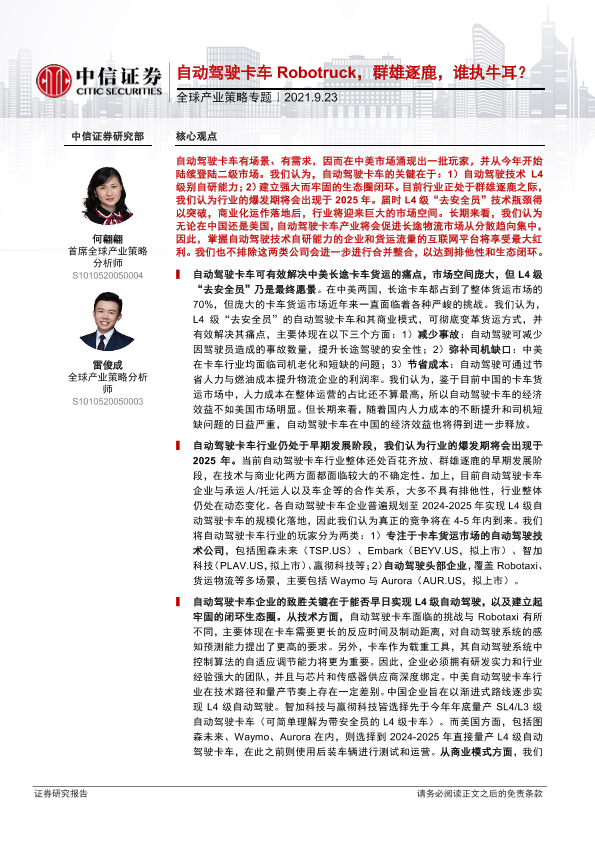 【中信证券】【20210923】全球产业策略专题:自动驾驶卡车Robotruck,群雄逐鹿,谁执牛耳?-48页