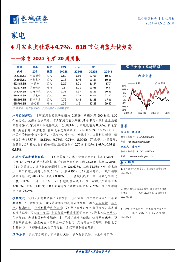 【长城证券】【20230522】家电2023年第20周周报:4月家电类社零+4.7%,618节促有望加快复苏-26页