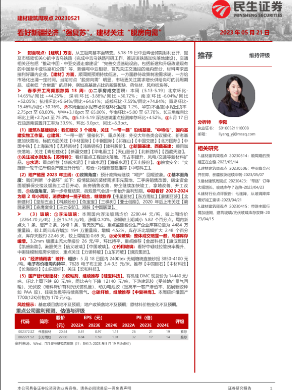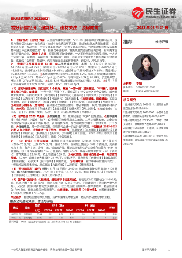 【民生证券】【20230521】建材建筑周观点:看好新疆经济“强复苏”,建材关注“脱房向需”-24页