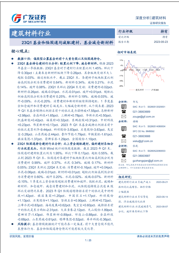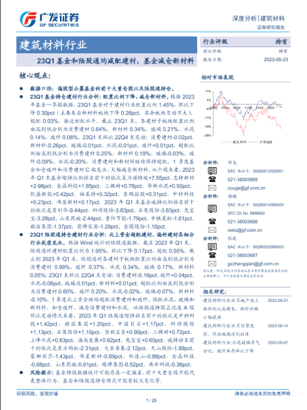 【广发证券】【20230523】建筑材料行业深度分析:23Q1基金和陆股通均减配建材,基金减仓新材料-25页