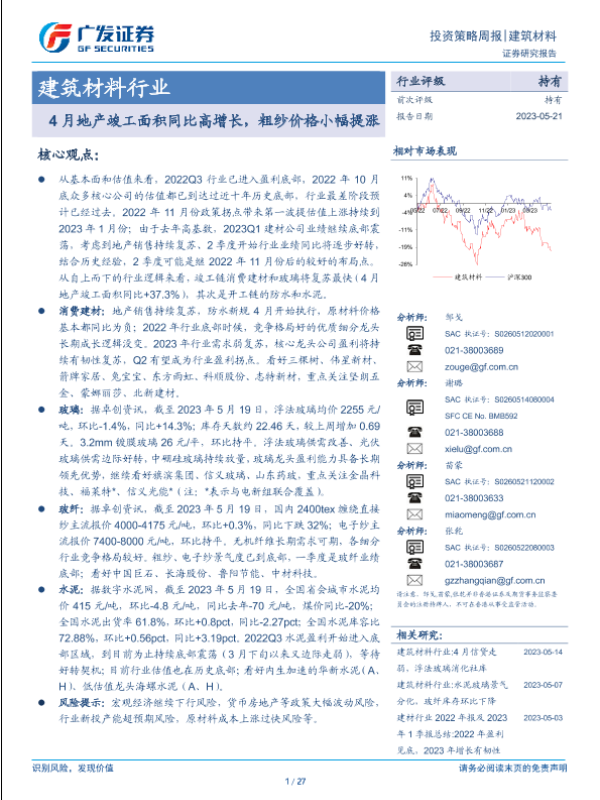 【广发证券】【20230521】建筑材料行业投资策略周报:4月地产竣工面积同比高增长,粗纱价格小幅提涨-27页